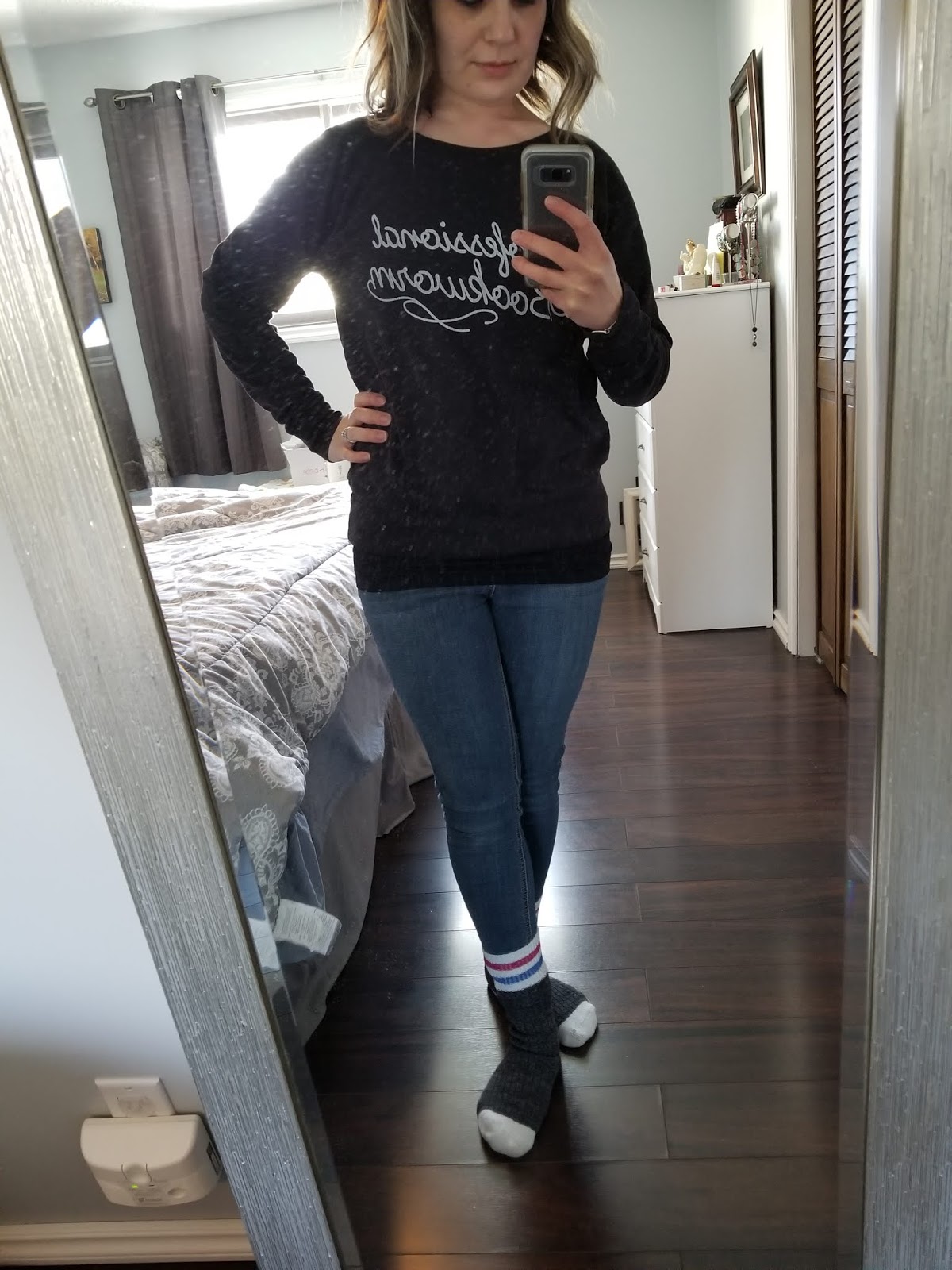 There are few items that I enjoy more than a sweatshirt with writing that amuses me. They are warm and cozy and keep the chill at bay. I know that they aren't particularly "fashionable" but they are my favourite thing to wear. That's what capsule wardrobes are all about. Wearing what you love!